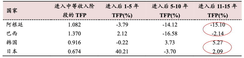 阿根廷和巴西在进入中等收入阶段后的 5-10 年内,其全要素生产率出现了明显的下降,进入中等收入阶段后的 15 年内,全要素生产率均为负;韩国和日本与拉美国家相反,在进入中等收入阶段后的 15 年内,全要素生产率显著为正。