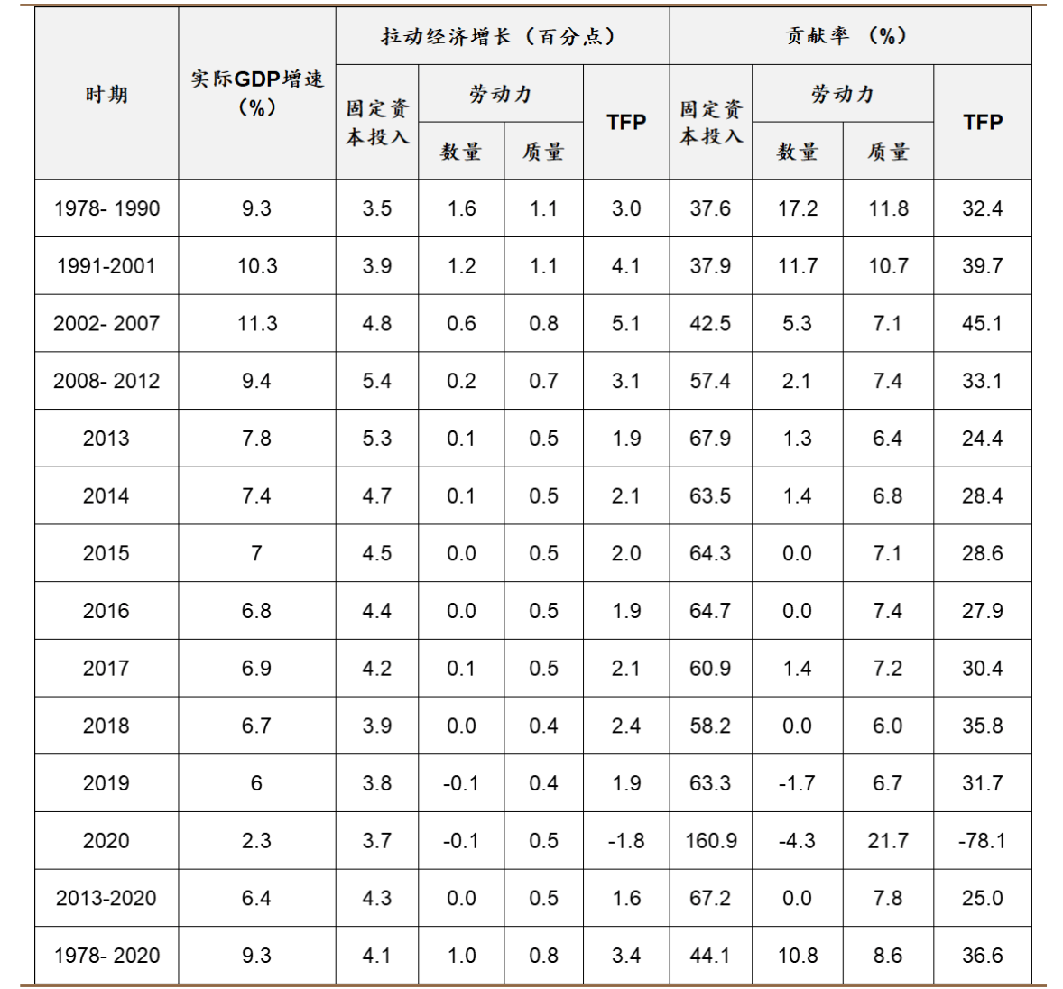 2013年至2020年期间全要素生产率的贡献率下降至25%左右;