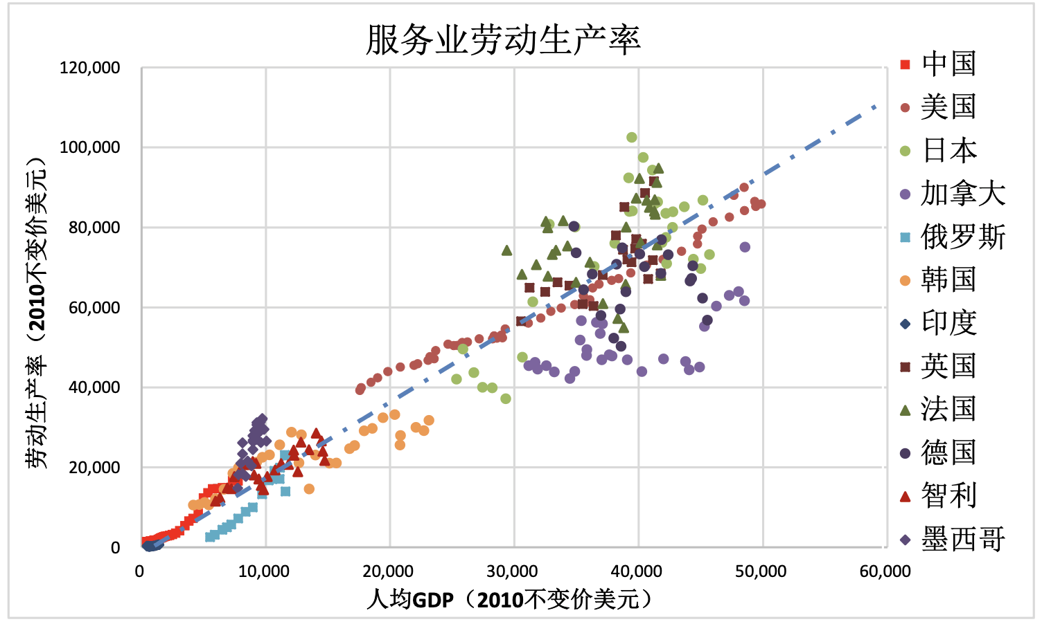 国际经验表明,服务业劳动生产率和人均 GDP 高度相关,高经济水平、高人均 GDP 往往伴随着较高的服务业劳动生产率。