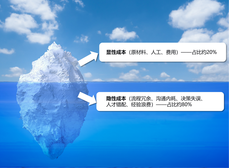 水面以下:隐性成本(流程冗余、沟通内耗、决策失误、人才错配、经验浪费)——占比约80%